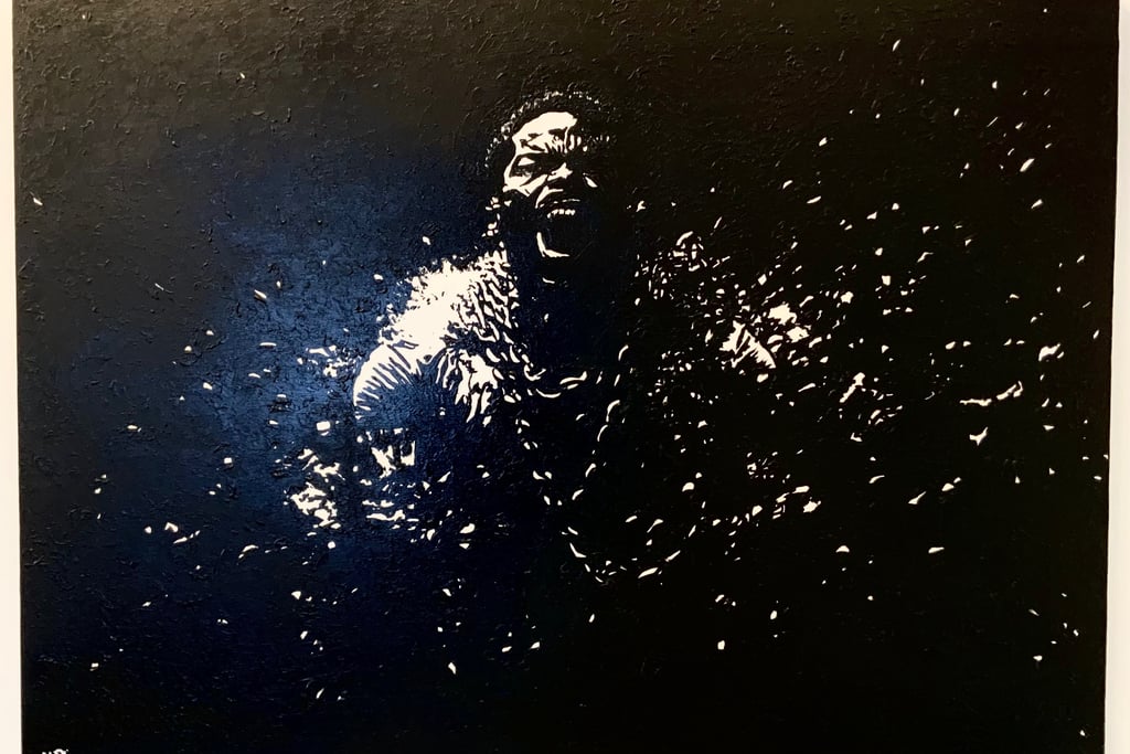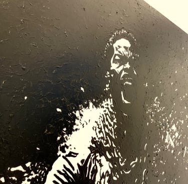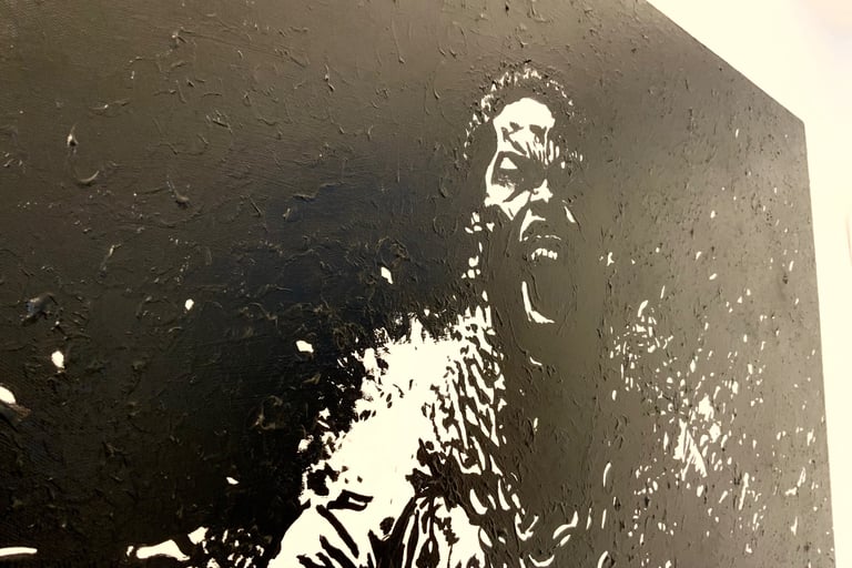 The metal of the chains becomes the metal of his own will, implying that the oppression itself created the precise force that destroyed it. The RAGE is not his alone, but the accumulated force of generations before him. The act is COMPLETE and by his own hand, intimating the shattering of an imposed identity. Size 110cm x 80cm x 4cm